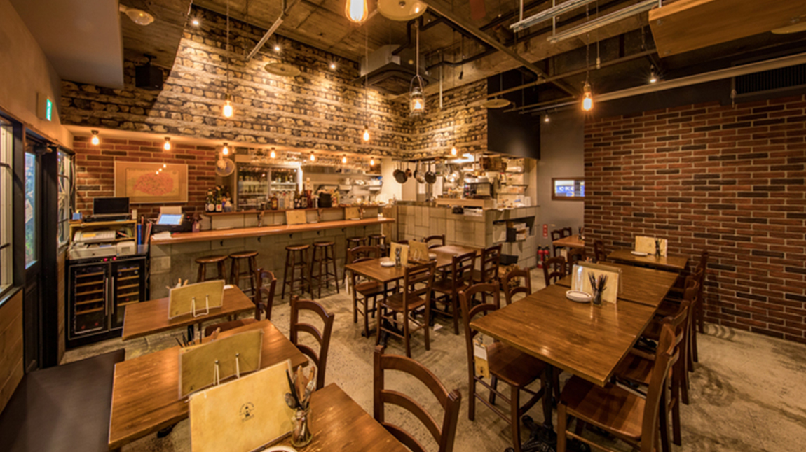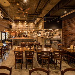 "天井からの吊るし照明" "レンガ風の壁" "大きなシーリングファン" "メニューが書かれた大きなブラックボード" "木目調で統一されたテーブルとイス" これらが絶妙にあわさってお洒落な雰囲気を醸し出す店内になっています! お席は全46席をご用意。立食スタイルの貸切りでしたら最大60名様まで対応できますので、宴会や結婚式の二次会などにもぜひご相談ください。