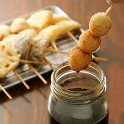 串揚げの本場大阪から取り寄せた衣・特製ソースを使用!自家製の串揚げは野菜、肉、魚介、バナナ!?とさまざまな種類からお選びいただけます♪ お財布にもやさしい“1本 98円”からご用意しているため、お腹いっぱいになるまでたっぷり注文してもOK! 当店の名物をぜひお召し上がりください!