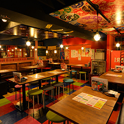 子供時代を思い出させるユニークな装飾、小物が印象的な店内。人生ゲームや野球盤の天井画、牛乳瓶、色鉛筆など、昔話に花を咲かせながらタコパ♪というのも当店ならではの楽しみ方の一つです。 全60席と広々とした空間は貸切も承っています。ご希望の際はお気軽にご相談ください!