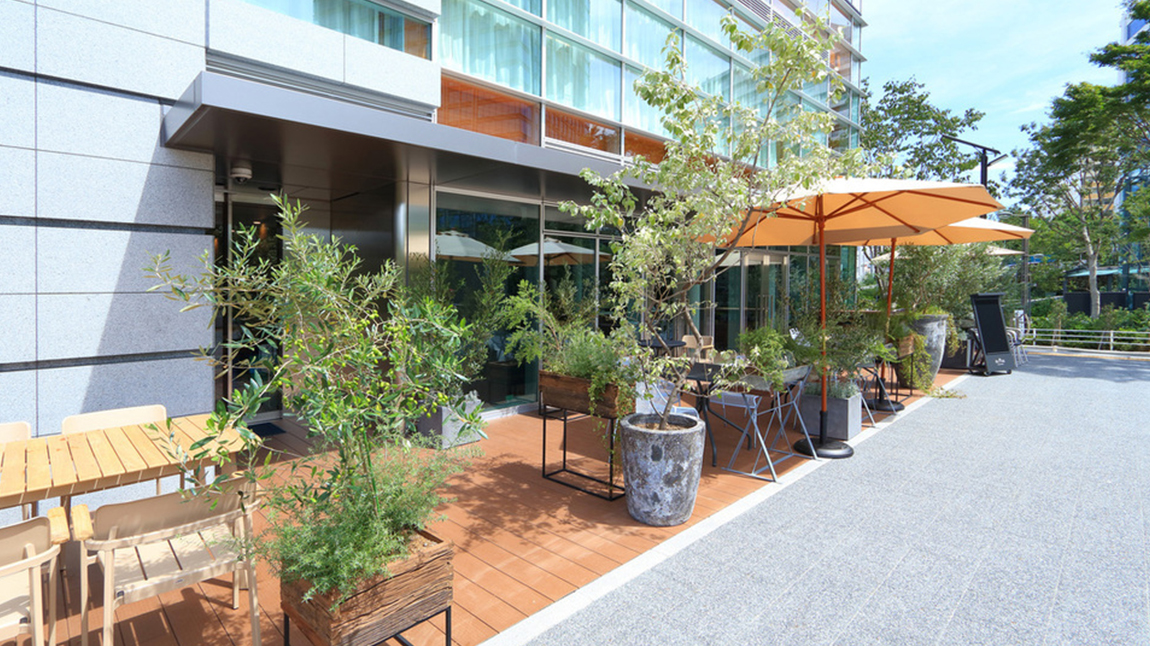 外観も内観もスタイリッシュでラグジュアリー!さらに、テラス席が広々した空間で緑も楽しめる! とても山手線がすぐ脇を走っているとは感じさせない落ち着く空間です!!