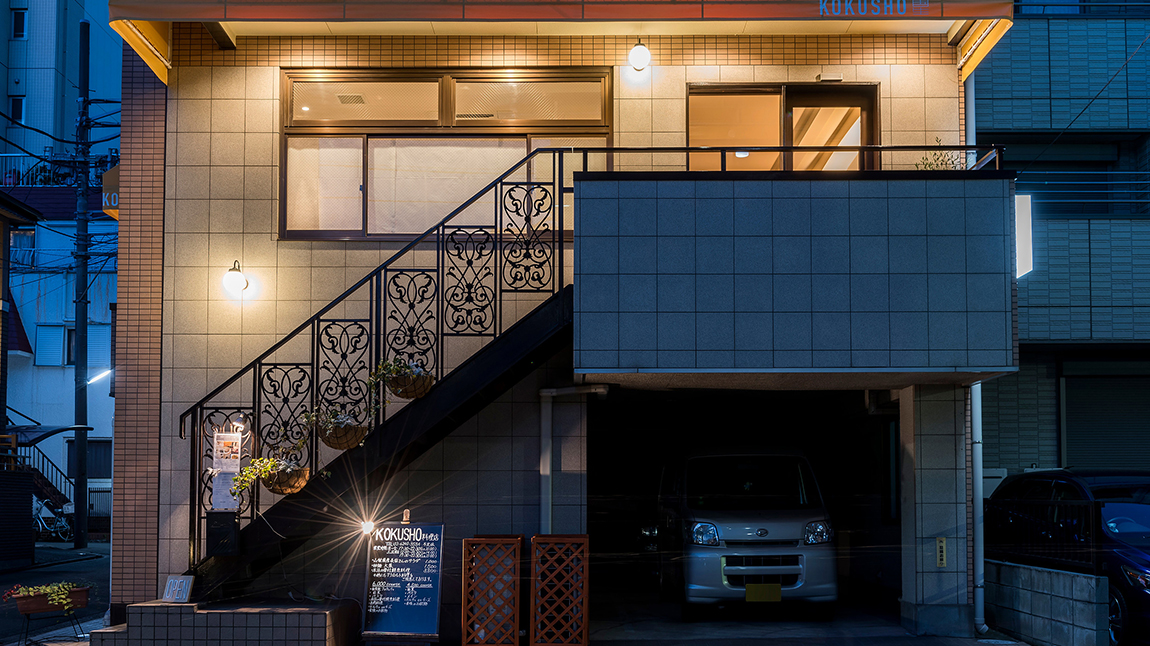 閑静な住宅街の一軒家の2階にある【KOKUSHO】 店内は大きな窓が2面にあり、昼は自然光を、夜は暖色の外光が雰囲気を作る、ゆったりと食事を楽しめる雰囲気となっています。