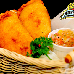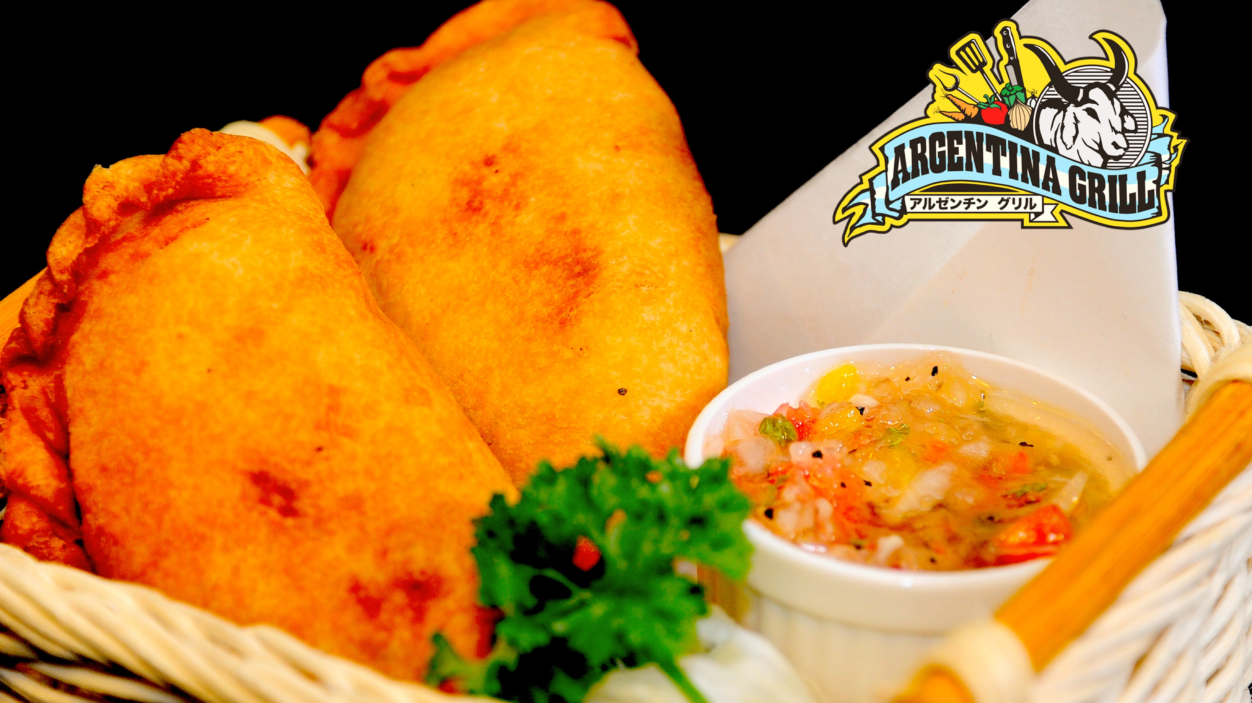 具を半月形のパイ生地の中に挟んで焼き上げた料理で、本場アルゼンチンではパーティーの前菜として使われることもある人気の一品。当店オリジナルのサルサソースとの相性は抜群!ミートとチーズの2種類ございます。ぜひ一度ご賞味ください!
