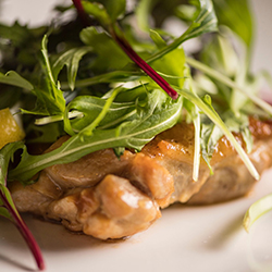 歯ごたえのある食感と強い旨味とコクが特徴で、ミネラル豊富なバリの天然塩でこんがりと焼き上げた贅沢な一品。たっぷり乗ったベビーリーフを添えて、ジューシーな鶏肉があとを引く旨さ!バリのビール「Bali Hai」とも相性抜群となっております!