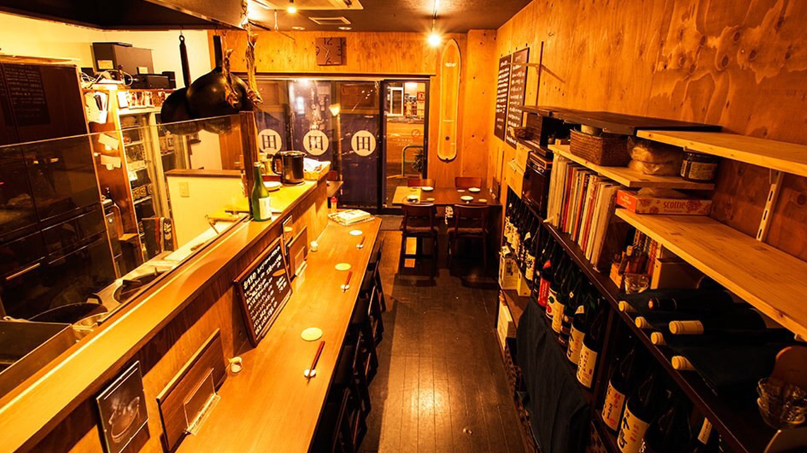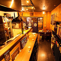 大きな青色のタペストリーを目印に店内に入っていただくと、暖色系の照明が心地よく、木のぬくもり溢れた和の空間が広がります。カウンター席とテーブル席で全20席あるため、一人呑みや気の合う友人との食事など、様々な用途に合わせてご利用いただけます。 笑顔が絶えない気さくなスタッフとともに、皆様のご来店をお待ちしております。