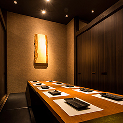 和モダンな雰囲気漂う大人の隠れ家のような店内。 扉付きの完全個室は2名様の少人数から、50名様までの大人数まで対応。デートや記念日などプライベートなひとときを過ごすのはもちろん、忘年会などの宴会にもご利用いただけます。