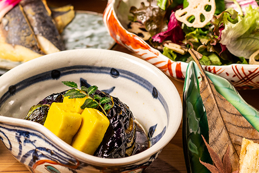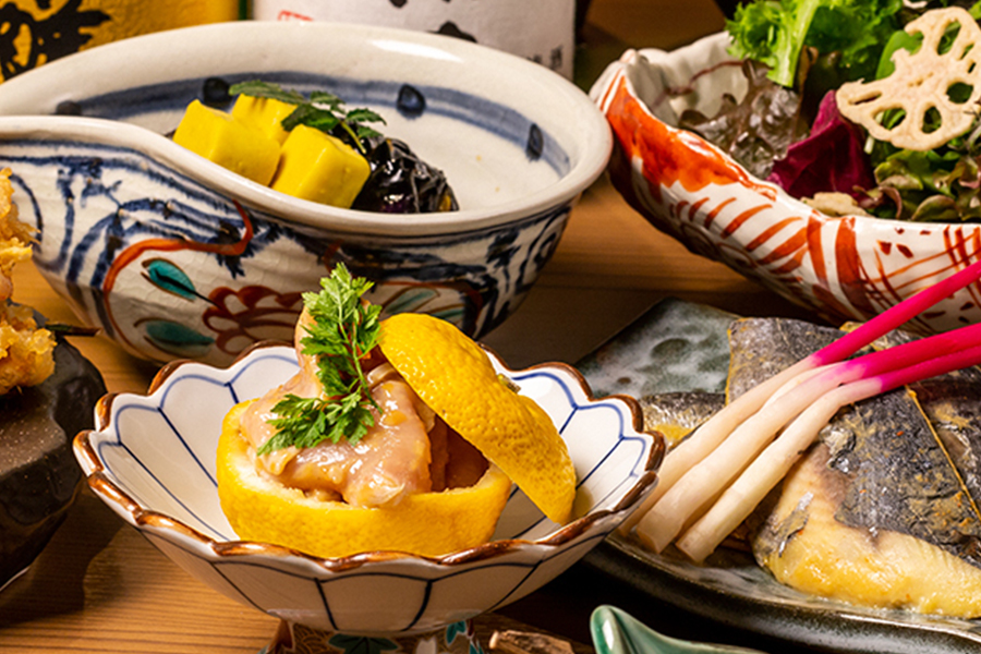 銘柄地鶏を使用した「大山どりの岩塩焼き」や、「大山どりのジャンボカツ」をはじめ、「九条葱と豆腐の焙煎胡麻サラダ」「季節の野菜のフリット」「長茄子の塩ステーキ」など、契約農家より直送の京野菜や鮮魚を料理人こだわりの調理方法でご提供!