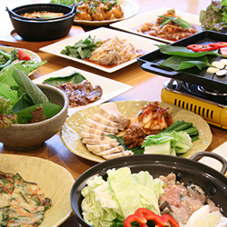 12時間以上煮込んだ『サムゲタン』、10分以上かけて丁寧に焼きあげる具沢山な『特選チヂミ』は、食材・調味料・調理法すべてにこだわった当店自慢の逸品です。季節毎の旬菜の手作りナムルとともにご賞味ください。 水曜・木曜日は毎週産地から直送している旨み溢れる飛騨牛のホルモンを使用した特別メニューもご用意しております。
